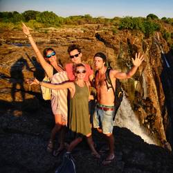 Wir rennen also über Stock und Stein zum Devils Pool - Charly und Daniel bezweifeln wohl immer mehr, dass dies ein Entspannungsurlaub wird - reißen uns die Kleider vom Leib. Jetzt muss alles schnell gehen. Zuerst müssen wir einen Teil des Sambesi-Flusses schwimmend überqueren (Aaaahhhh gestern haben wir hier drin noch Flusspferde und Krokodile gesehen!!), dann wieder über glitschige Steine klettern und plötzlich stehen wir vor dem “Pool” am Abgrund der Wasserfälle.