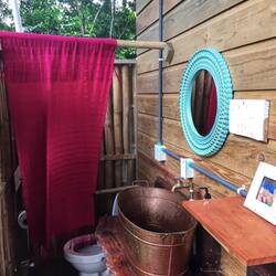 Nach der Woche mitten im Partyviertel von Bocas del Toro genießen wir hier die Ruhe der Natur. Klopfende Spechte, krächzende Papageien, schreiende Brüllaffen. Es geht hier richtig ab rund um unser Baumhaus. Von der Open-Air-Dusche aus kann man den Affenzirkus im Baum beobachten und vom Bett aus kann man durch die Glasfront in die Weite auf das Meer schauen. Traumhaft.