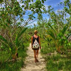 Mit unserem Motorrad erkunden wir am nächsten Tag die Insel. Ich bin unglaublich dankbar, dass Felix so ein guter Offroad-Fahrer ist, denn die Wege bestehen hauptsächlich aus Kiesel, Steinen und Löchern und jedes Mal, wenn Gegenverkehr kommt, werden wir komplett in Staub eingehüllt. Es ist nicht zu übersehen, dass sich die Region am Ende der Trockenzeit befindet.