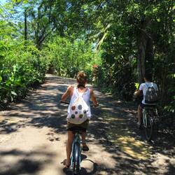 Mit unseren Beach-Cruisern cruisen wir jeden Tag in der Gegend herum, zum Beispiel zum Cahuita-Nationalpark. Der 8 Kilometer lange Pfad führt uns durch dichten Dschungel, indem Charly von frechen Kapuzineräffchen bedroht wird und schlängelt sich immer wieder raus an strahlend weiße Strände. Das Highlight dieses Parks sind für mich eindeutig die Waschbären. Ihr Gesicht erinnert mich ein bisschen an Erdmännchen, beiden sehen sie aus wie Banditen.