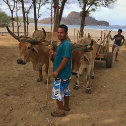 Die Wochen vergehen wie im Flug und ich schließe immer mehr Freundschaften hier in El Gigante. Zum Beispiel mit dem hier wohnhaften Will. Aufgewachsen auf den Corn Islands in der Karibik, zeigt er mir eine ganz andere Seite Nicaraguas auf. Schnell wird mir klar, dass er sich selbst nur halb als Latino wahrnimmt. Die andere Hälfte seiner Identität ist Caribeño. Seine Muttersprache ist Creollo. Das klingt wie ein sehr lustiges Jamaica-Englisch, das man aus Dancehall und Reggaeliedern kennt. Bis er 11 Jahre alt war, hat er auf der großen Isla de Maíz gelebt, ohne Strom. Eine seiner Hauptbeschäftigungen war es, auf Kokosnusspalmen zu klettern und die Nüsse herunterzuholen, um damit frische Kokosnussmilch zu machen. An der Karibikseite Nicaraguas ist Kokosnuss Grundlage für so ziemlich alle Gerichte. Will ist ganz stolz auf die karibische Küche und zweimal komme ich dann auch in den Genuss, diese testen zu können: Das erste mal kocht er eine Fishball-Coconut-Soup und das zweite Gericht heißt „Rundown“. Ein traditioneller karibischer Eintopf auf Kokosnussbasis (die Kokosnussmilch natürlich selbst hergestellt) mit Fisch und Krabben. Dazu gibt es Kokosreis mit Erdnüssen. Wir sitzen auf der Terrasse seines Häuschens auf dem Hügel La Lomita, von dem aus man einen überragendem Blick zu beiden Seiten hat: links der Playa Gigante und rechts der Playa Amarillo. Außer mir sitzen nur Nicas am Tisch und ich bin die Einzige, die sich doof anstellt bei den Krabben. “Just suck the hell out of em!” Ich zutzle an dem Schalentierchen was das Zeug hält, aber richtig erfolgreich bin ich nicht. Naja immerhin trage ich zur Belustigung in der Runde bei :)