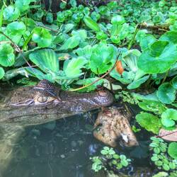 Auf den Wasserpflanzen entdecke ich eine Schildkröte und einen Baby-Kaiman direkt neben unserem Kayak.