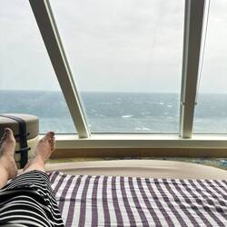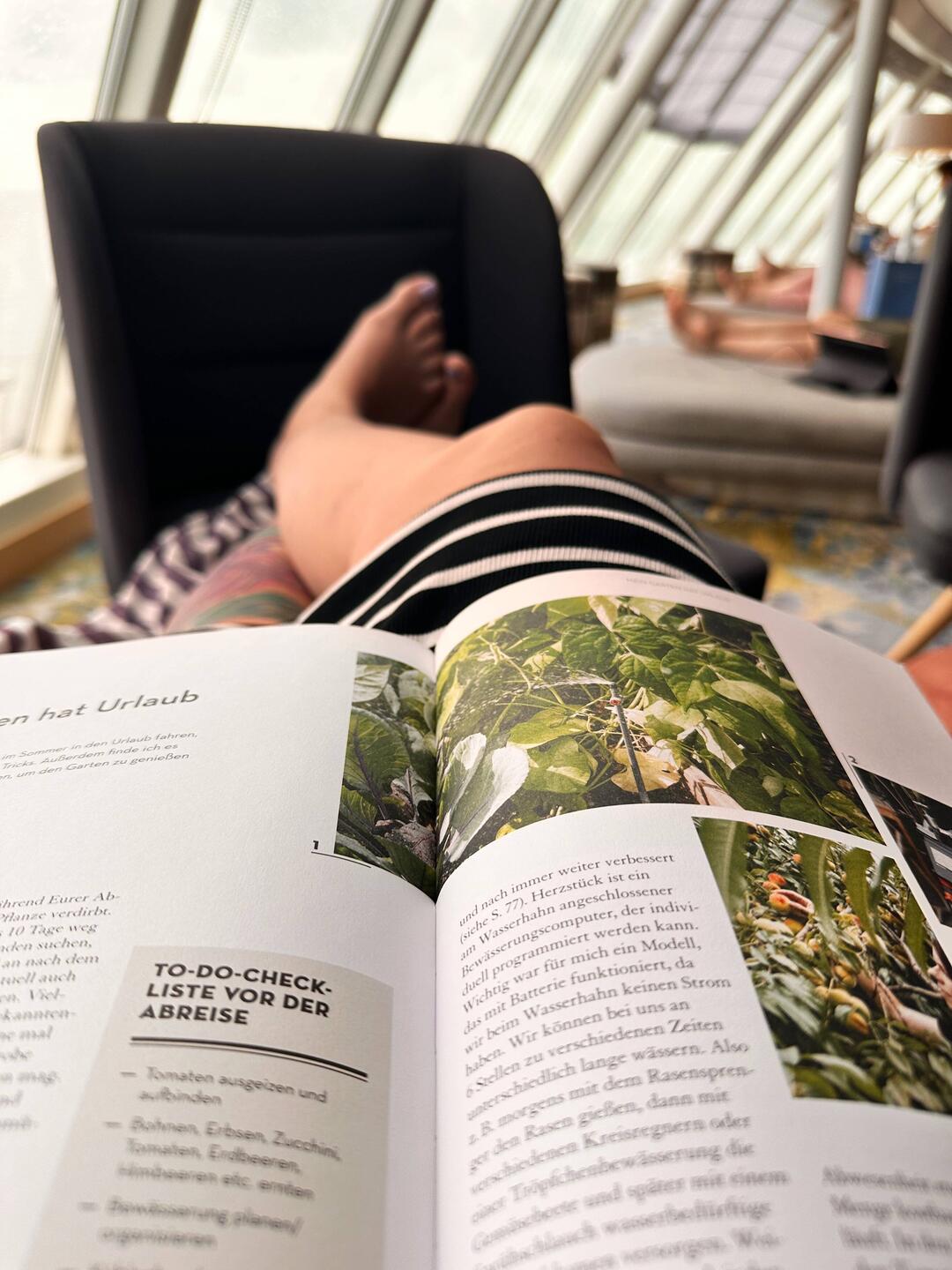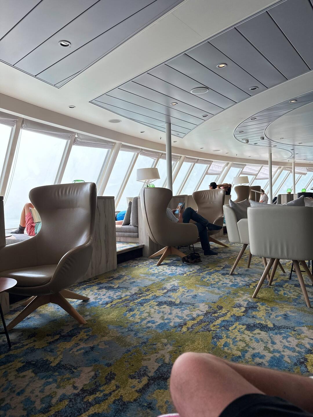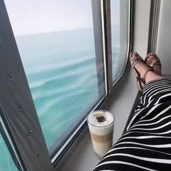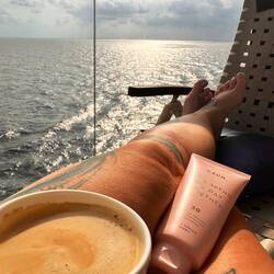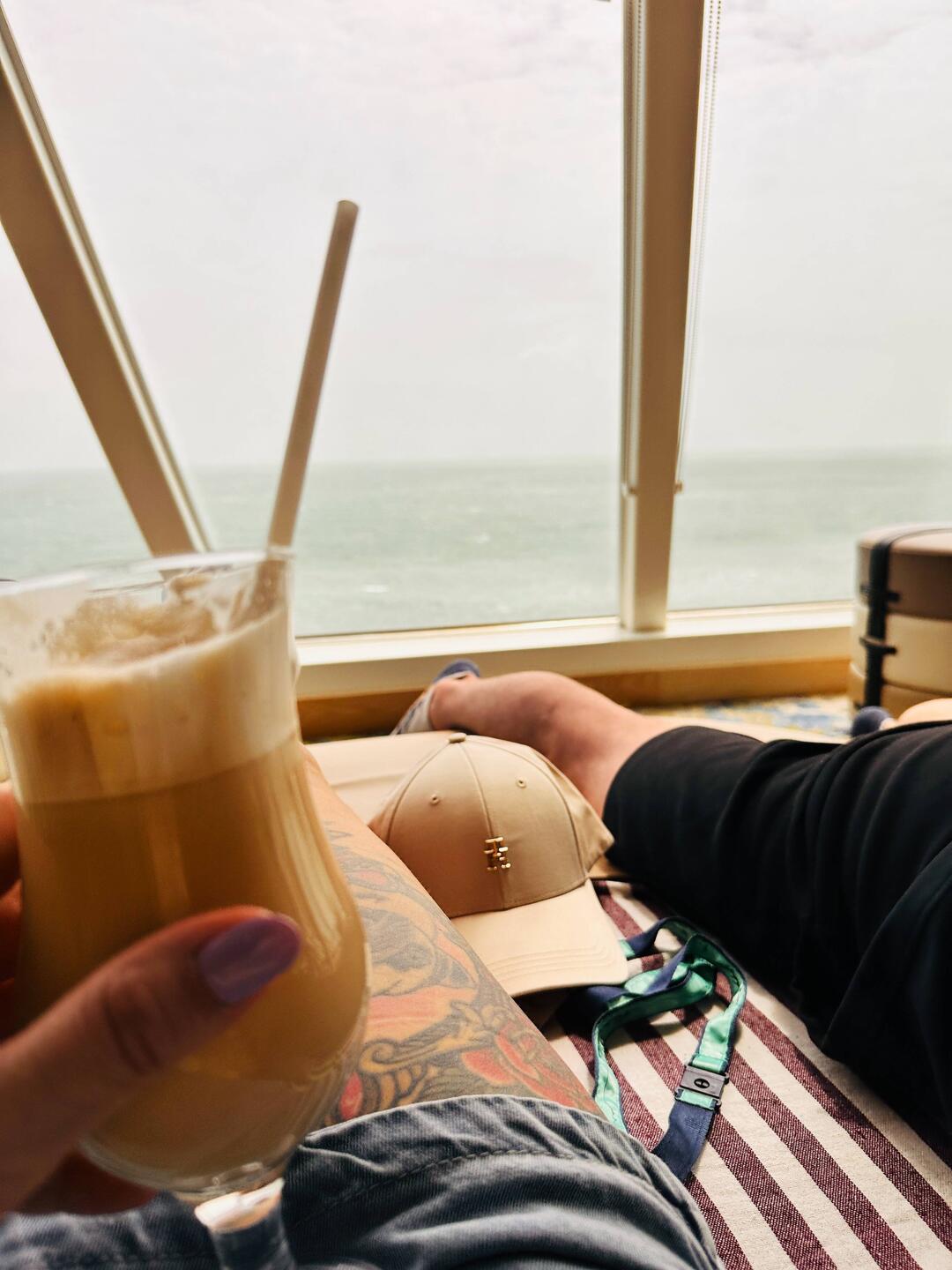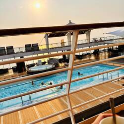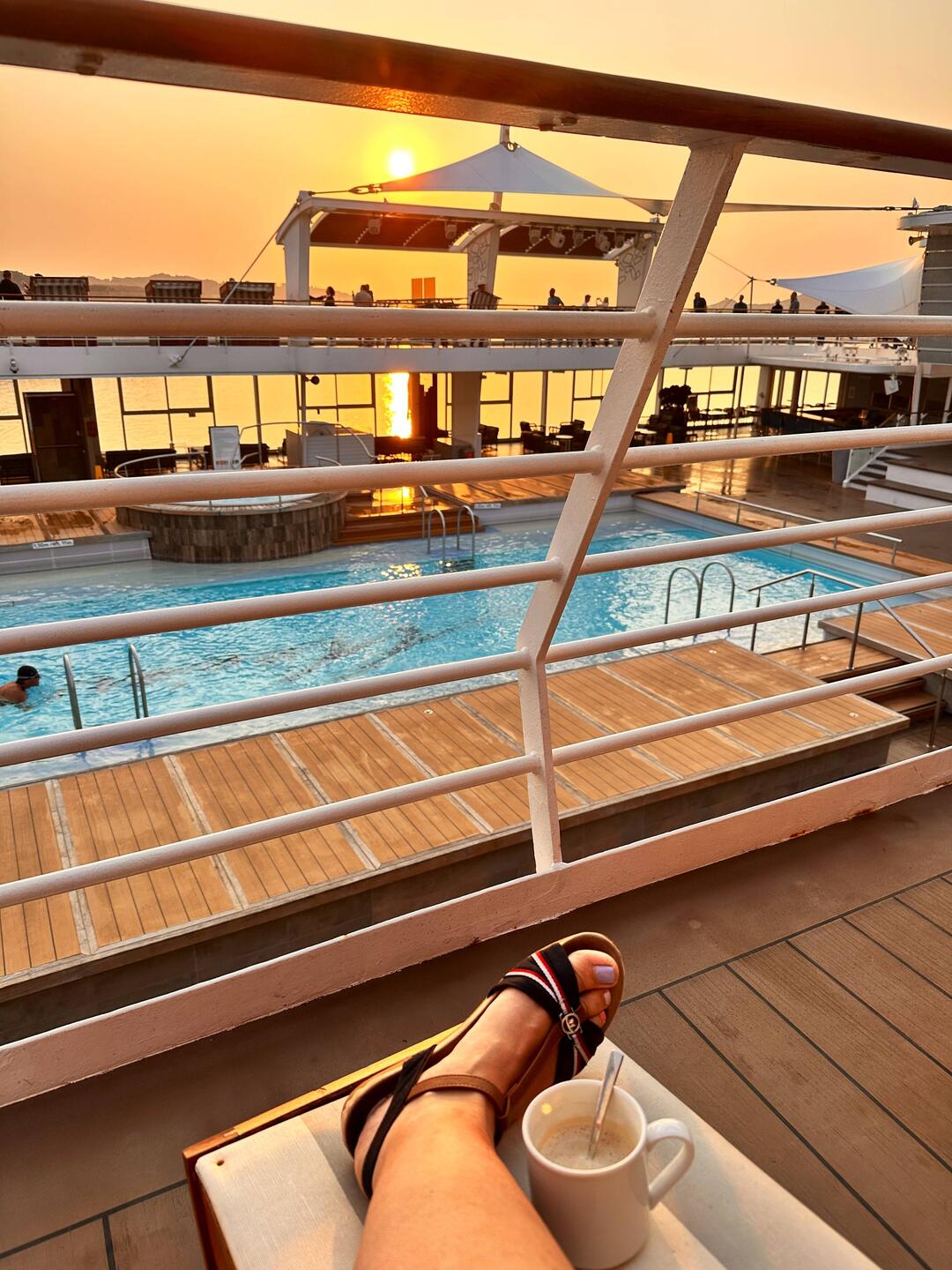 Früh um 7 den Tag gemütlich mit Kaffee, im Strandkorb und am leeren Pooldeck gestartet.