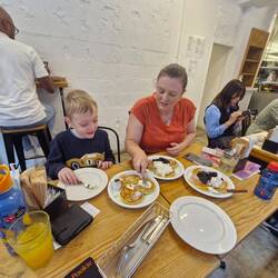 We folded the pram and squeezed in for three pancake sets; 2 blueberry jam and one plain with maple syrup plus a couple juices!