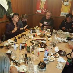 Tired feet found our way back to the hotel for a meet, greet and dinner with our tour guide Mari and eight of the 10 tourists to join us (two arriving tomorrow) as follows - Nigel (US), Ramesh (Auckland), Mara (London), Tony (West Australia) and Matthais & Sabrina (Switzerland). Nigel, Tony and Ramesh were a fair bit older (50+) and the other three probably around our age. Dinner was a fantastic feast of various Japanese tapas; croquettes, noodles, salad, fried chicken, cook your own meats, beer and even a sushi boat.