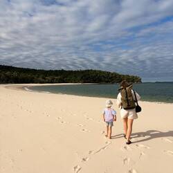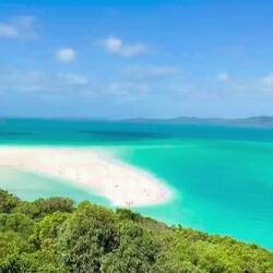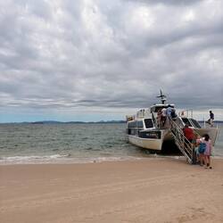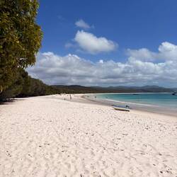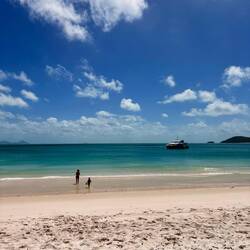 Klappt alles und es geht auf den großen Katamaran. Ca 1,5h Fahrzeit bei mit Tee/Kaffee, Obst, Brownies & Muffins. Vorbei an dicht bewachsene grünen Inseln legen wir am Nordende des weißen Strandes, der Sand besteht aus 99% Quarz und ist ganz fein, daher wird er auch nicht heiß, es quietscht beim Laufen. Einzigartig auf der Welt meint der Guide. Wir suchen uns einen Schattenplatz unten den Bäumen und es laufen uns 2 große Echsen über den Weg.