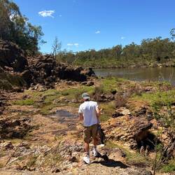 Ein 15 minütiges (Bio-) Päuschen zum Beine vertreten an der Calliope Old Bruce Fishing Bridge..