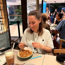 Miri versucht mit Stäbchen zu essen, haben dann doch Besteck geordert.