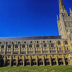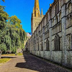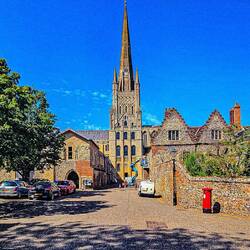 Die normannische Kathedrale von Norwich ist eines der ikonischen Gebäude der Stadt und dominiert die Skyline mit einer 96 Meter hohen Turmspitze, die nach Salisbury die zweithöchste des Landes ist.Læs mere