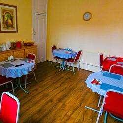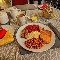 Das traditionelle Englische Frühstück umfasst vor allem zarten Toast mit gesalzener Butter und Marmelade (Orange, Zitrone), gegrillte Tomaten, gebratene Würstchen und Champignons. Legendär undLæs mere