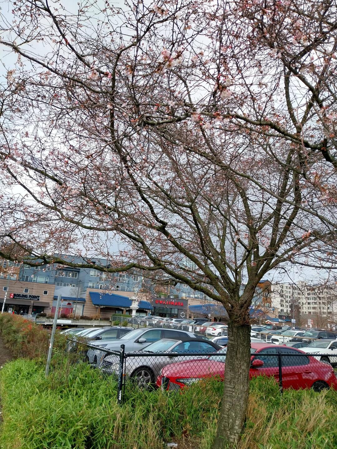 Zwischen Beton und Schildern hängen Kirschblüten wie einRead more