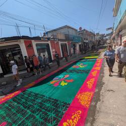 Nevertheless, both Ixil and Uspantek belong to the Quiché department, or k'iche'. I didn't visit the Ixil — one or two mountains too far— but did end up in Uspantán, which lies up a long climb starting at 620 and ending at 1800 meters. And I had a surprise waiting for me on Friday the 3rd, when I had planned to continue on to Sacapulas (another small Maya town). Well, two surprises, as on Thursday I learned about the platana drink, which is made from plantains. But the bigger one was on Friday: Viernes Santo, or good Friday! (I am not keeping track of the calendar properly...). I had heard of there being parades worth seeing on this day, and they put up very delicate, very long, very beautiful "carpets" all through the town. And as far as I know, overnight(!), because I didn't see them on Thursday evening.