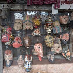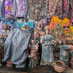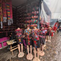So what was the market about? It was a very interesting mixture of local stuff, with lots and lots of stands selling the traditional fabric for the Mayan dresses, called "Huipils", lots of fruit stands and vegetables, some stands selling souvenirs and crafts, some selling masks for traditional dances, and some of course selling all kinds of clothing. Some also couldn't decide and sold the traditional fabric, but also meat in between. Live animals were also to be found, and on the steps to the church were the flower ladies located. Of course some of the vendors were quite aggressive in trying to sell stuff and get my attention — also because I was really the first gringo walking around — but not overly, and they were super friendly or relaxed throughout (unlike some experiences I have of Zanzibar). Haggling was definitely to be done though, because the prices went down significantly during some interactions I had...) The one thing I was really hoping to buy here, sandals, I didn't manage to find here. Sandals for men just doesn't seem to be a thing here.