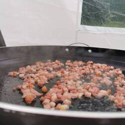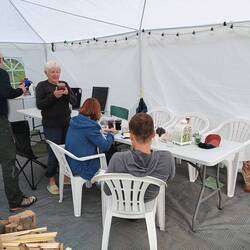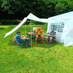 Nach einem regenreichen Aufbau, alle sind klitschnass, geht es jetzt ans gemütliche Frühstück im Pavillion.