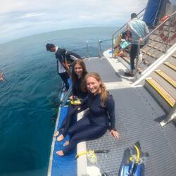 At 6:30am music came on over the speaker and we were all woken up for the day. We had brekkie which was cereal, toast, and fresh fruit and then got dressed as we started sailing to our first destination of the day. We went to Whitehaven Beach where we went on a walk up to 3 lookout points and then headed to the beach to spend a couple of hours. Whitehaven beach has the clearest waters and you can walk out so far. Whitehaven Beach is known for its very fine white sand, which is 98% pure silica. The sand here does not retain heat so it is very comfortable to walk on it barefoot. If you get caught trying to take sand home from Whitehaven Beach you will get a $10,000 fine; the sand is very protected. We saw baby reef sharks and stingrays (good thing we had our suits on) while swimming in the water. We headed back to the boat and had lunch (some pasta salads and sandwiches) before heading to our afternoon spot where we had the choice to snorkel (which was included on the tour) or pay extra to go scuba diving. I decided to pay and do the scuba dive and man, am I glad I did. It was such an incredible experience. We got all geared up, the tank was about 30 pounds and then they put a weighted belt on you as well to help when you are in the water. We took a small boat to the area we were scuba diving and learned all the signals and how to breath in the water before going down. The instructor had me and the other girl (Emma) on our knees under water to get used to breathing. I came back to the surface because I felt like my lungs were tired from breathing in and out too hard and I started panicking thinking I wouldn’t be able to breath when I went under. It turns out I was breathing way harder than I needed to be, so once he explained that to me, I was able to calm down and go back under the water. We gradually made our way down along the ocean floor, we went down to 12 meters, which is 39 feet. It felt amazing being able to swim along the fish and coral and not having to worry about coming up for air. Typically, your first time diving the instructor will be linked up to you but ours let us swim behind him on our own which was sooo cool. When scuba diving, you need to keep your body horizontal and keep your head down; so in order to go deeper into the water you need to exhale air and to move up in the water you need to inhale air. This seems like it would be hard but it was surprisingly easy to do. I am so happy that I decided to scuba dive and proud of myself for getting out of my head about the breathing and really let myself enjoy it; if I saw a shark I may have freaked out though! We were down there 20-30 minutes before coming back to the surface. I would definitely recommend everyone try it at least once. We got on the boat and made our way to a beach with our wine, where we got out to watch the sunset (due to cloudy skies there really wasn’t much of a sunset). We returned to the boat for dinner, which was spaghetti bolognaise with garlic bread and salad, and had our final night drinking on the boat together. While we were all drinking we saw 3 stingrays in a mating circle next to our boat, where they stayed for hours just swimming in a circle. Unfortunately, I didn’t see any other wildlife from the boat. It is crazy how quickly you become close with other people when almost everyone is traveling alone and you spend 2 nights on a boat in the middle of the ocean together. A bunch of us decided that we were going to sleep on the deck of the boat since it was so hot in the cabins the night before. The breeze was amazing but about 25 minutes after laying out there on beanbags, it began to rain so I went back to my bed while others slept upstairs on the kitchen floor and kitchen wrap around couch. It is crazy how quickly you become close with other people when almost everyone is traveling alone and you spend 2 nights on a boat in the middle of the ocean together.