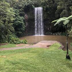 Today I went to Atherton Tablelands, a region of rainforests and waterfalls. This was another early morning, I got up at 6:45am to walk and meet my tour group. Unfortunately, it was pouring out but it actually ended up working out great because the waterfalls were in full effect. Our first stop of the day was at a rainforest where we went for a walk and then had morning tea and biscuits at a couple of picnic tables under a gazebo. We were all soaking when we got back onto the bus. Our next stop was Josephine Falls, which has a huge waterfall and then a flat rock in the water that is used as a natural water slide that you can slide down when swimming. Due to the weather the falls and water flow was very strong and we were unable to go swimming here. It was still amazing to see, and crazy to hear how high the water levels had gotten overnight because of all the rain. We then got on the bus and went to Milla Milla Falls, this waterfall is famous for being the location they filmed one of the herbal essence commercials. You can’t visit here and not take a picture flipping your hair in the water. Since the weather wasn’t great, we were the only group here. The rain didn’t affect the swimming conditions here so me and a couple other girls decided to get in for a swim. The water was pretty cold and it was very rocky making it difficult to walk into without hurting yourself. We got our hair flip pictures, swam next to the waterfall and then got out to have lunch which was an assortment of different deli meats and veggies to make sandwiches. We stopped to see the Cathedral Fig Tree (an enormous 500 year old strangler tree) to take some quick pictures. Our last stop of the trip was to Lake Eacham, which has beautiful blue green water and has a freshwater crocodile in it that has been sighted on very rare occasions. Some people choose to go for a swim, I decided to take a walk around the lake to take in the scenery. It was a beautiful walk through the woods with views of the lake peaking out here and there. We had another snack before getting onto the bus to head back to Cairns. On my walk I managed to get bit by a leech between my second and third toe. When leeches bit they insert an anesthetic and anti clotting so you don’t feel that you got bit and it bleeds a lot. By the time I noticed the leach had already fallen off my foot. Very strange. The beginning of the day was very wet but midday the sun came out and it actually turned out to be a great day. When I got back to the hostel I packed my bags because I was leaving the following day.