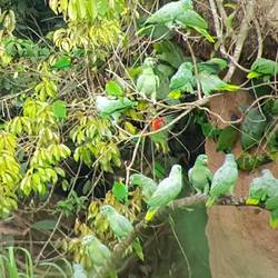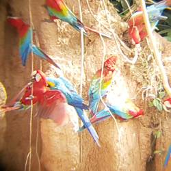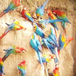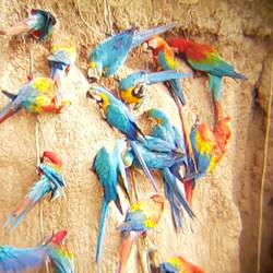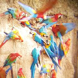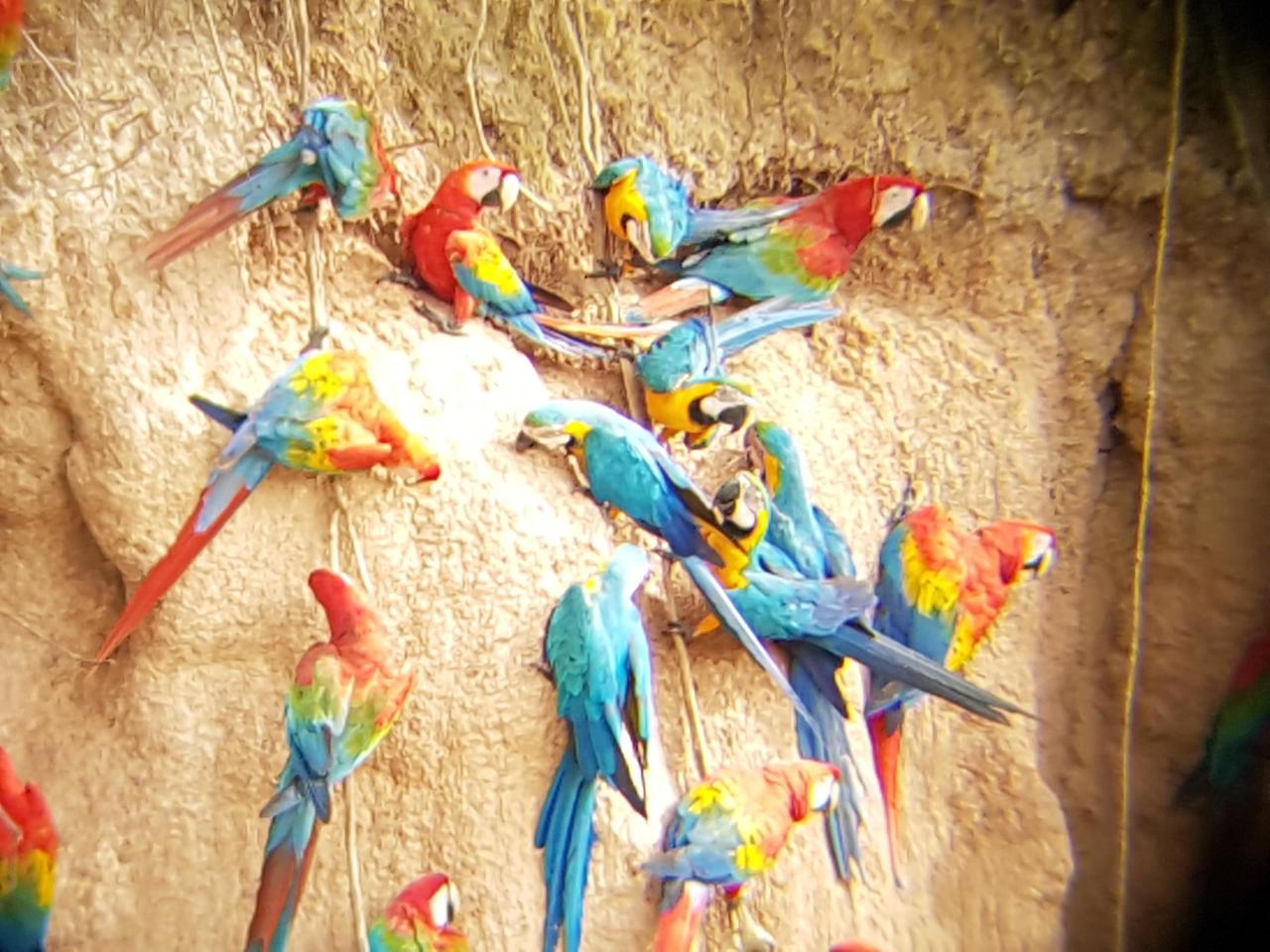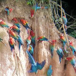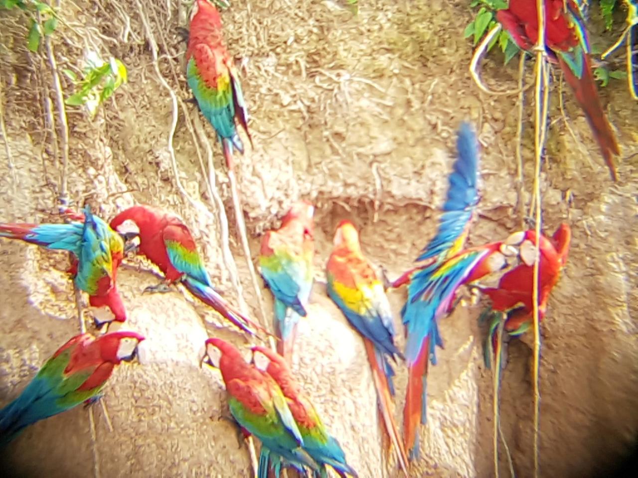 Bu about 7:30 am, all the smaller birds and parrots had left and the left cliff was empty. The macaws started eating clay a bit later and they all converged on the right cliff. It was a riot of colorsLeggi altro