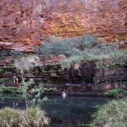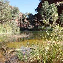 Nun sind wir also da, im schönen Karijini Nationalpark. Mintgrünes Spinifex-Gras, pinkfarbene Mulla-Mulla-Wüstenblumen und die Eukalyptusbäume färben die sanften Hügel ein, zwischen denenLeggi altro