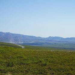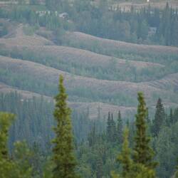 Der "Top of the World Highway" geht über einen Bergkamm bis an den US Grenzübergang. Eigentlich soll es hier wunderschöne Sicht geben aber durch die vielen Waldbrände im Yukon hängt seit Tagen der Rauch wie starker Dunst in den Tälern. Durch den Yukon konnte man nur noch sporadisch durchs Feuer fahren, jedoch wurde der Highway teilweise gesperrt. Die Einheimischen hier scheinen von Waldbränden nicht sonderlich beeindruckt zu werden. Es ist für sie sommerlicher Alltag.