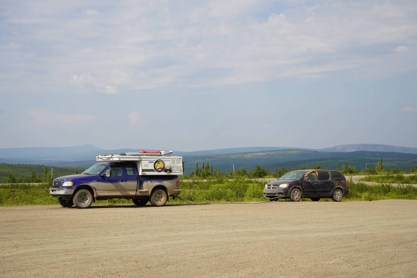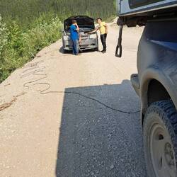110km von Eagel Plain (Kleine Tankstelle im Gebirge) entfernt trafen wir dann zwei Reisende am Strassenrand welche uns zugewunken haben. Sie waren auf ihrem ersten langem Roadtrip und hatten den Dempster und die dafür benötigte Ausrüstung wohl ein wenig unterschätzt. Leider ging ihr Alternator auf dem Rückweg vom arktischen Ozean kaputt. Da ein Alternator hier oben nur sehr schwer zu besorgen ist oder Wochenlange bis Monatelange für die Lieferung benötigen würde haben sie sich in der Not eine Zweitbatterie gekauft, damit sie länger fahren können bis sie dann zum Stillstand kommen. So fuhren sie mit Volldampf und wenig Schlaf auf dem Dempster und landeten dann irgendwann im Graben auf der Seite des Fahrzeugs. Die vorbeifahrende Polizei hat sie dann aus dem Graben gezogen und ihnen eine Unterkunft für die Nacht gewährt. Nach nur einer Stunde wollten die beiden dann wieder weiter und suchten Hilfe am Strassenrand neben ihrem liegengebliebenen ramponierten Auto. Die Situation war eher aussichtslos und sie erzählten uns, dass viele andere Reisende einfach an ihnen vorbeigefahren sind. Wir entschieden, dass wir die beiden nicht einfach hier draussen lassen können und wir sie mit unserem Abschleppseil 110km bis nach Eagel Plane abschleppen werden. Wir hatten auf dem Hinweg gesehen, dass es an der Tanke noch eine kleine Werkstatt gibt und hofften, dass diese irgendwie weiterhelfen können.