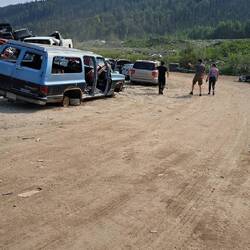 Unser Ziel war ein lokaler Teilehändler in Dawson der den beiden hoffentlich weiterhelfen kann. Die letzten Km verliefen reibungslos. Beim reinfahren auf den Parkplatz des Teilehändlers versagten die Bremsen des Wagens der beiden noch komplett und der Abschleppfehler Nr.1 passierte. Sie fuhren über unser Abschleppseil und es zerriss das mittlerweile ramponierte kinetische Seil (Eigentlich nicht für längeres Abschleppen sondern Bergung eines Fahrzeuges gedacht) welches auf 20T bruchlast gewertet ist!