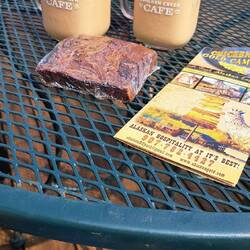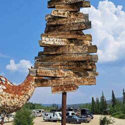 Nach der Grenze trafen wir wieder Dave und Marion und zogen in ein Dorf namens Chicken weiter. Chicken ist für ein Goldsuchcamp und seine Kuriositäten bekannt. In einer Bar kann man seine Unterhosen in einer Kanone abfeuern und sie dann an der Bardecke aufhängen. Wir knallten keine Unterhosen und tranken stattdessen einen guten Eiskaffee ;)Læs mere