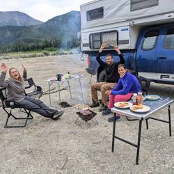 Nach unserer turbulenten Rückreise vom "Ende der Strasse" parkten wir erst mal in Dowson City und schauten uns die historische Goldgräberstadt an. Unser Schlumpf ist mittlerweile unter den Reisenden bekannt und so schrieben uns unsere deutschen Freunde Birgit und Mathias (Korrigiert uns bitte falls dies falsch ist wir haben ein durcheinander mit den Männernamen), dass sie den Schlumpf gesehen haben und ob wir bei ihnen nicht auf einen Kaffee vorbeikommen wollen. Natürlich konnten wir ein solches Angebot nicht ablehnen :). Es ist immer wieder schön sich mit anderen Reisenden auszutauschen, vor allem wenn es so tolle Menschen sind.