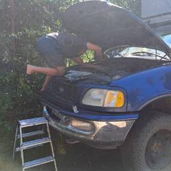 Bigna und DaveNach dem Dempster checkte ich den Schlumpf auf Beschädigungen nach den ganzen Strapazen. Das angerostete Rohr des Ölmessstabes ist durch die vielen Vibrationen noch ganz abgebrochen. Auf dem Schrottplatz habe ich mithilfe von Dave das Rohr eines anderen Fords ausgebaut. Ganz gleich war es nicht, jedoch für den Notfall nicht schlecht. provisorisch verschloss ich das Rohr mit einem Ohrpag, damit keinen Schmutz in den Motor kommt.