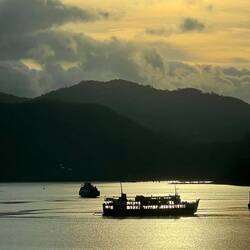 Colorful skies greeted. us as the silhouette of Langkawi emerged from the dawn. I’m curious what wonders await us on shore.
