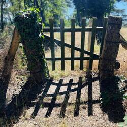 It rained during our visit, but Lar found a bench under a towering cedar that kept him dry.