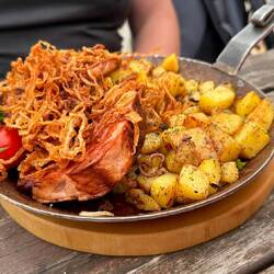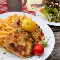 Hänchenbrust mit Alpenschinken, gefüllt mit Alpenkäse und Tomaten-Kartoffeln