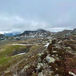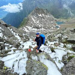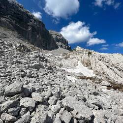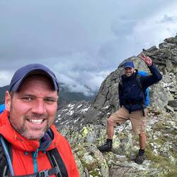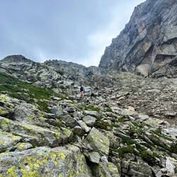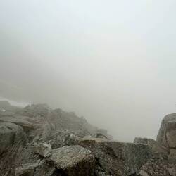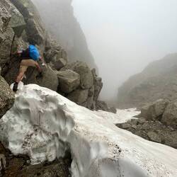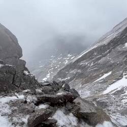 Es ging erst über Blockwerk nach oben, dann immer steiler mit etwas Kraxelei. Kurz vor dem Gipfel machte das Wetter aber dann doch zu. Das letzte Stück hatten wir noch eine spannende Stelle mit Schneeresten, die wir aber dann gut gemeistert haben.