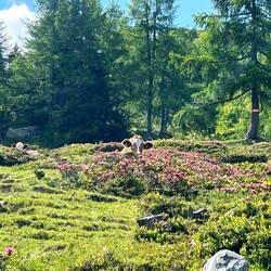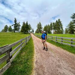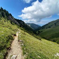 Gegen Mittag wurde das Wetter aber besser, man hatte mehr Sicht und auch der Weg war mittlerweile ein angenehmes auf und ab über eine Hochebene mit schönen Wiesen und Lärchenwäldern.