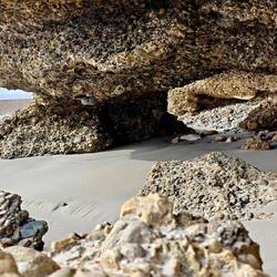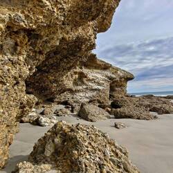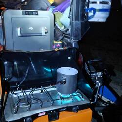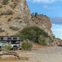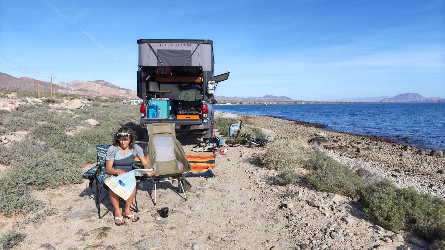 Camping and staying put, coffee, stretching, long walk on rocky beach, lunch, hike a canyon, dinner and a movie.