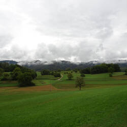 Schon heute Morgen ziehen tiefhängende Wolken durch die Region. Ich folge dem hügeligen Weg über Feldwege, Wiesen, Asphalt und Forstwegen bis zum Eichener See. Dort treffe ich in der angrenzendenLeer más