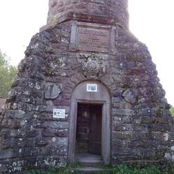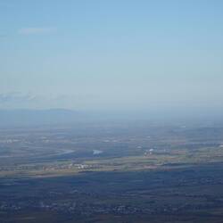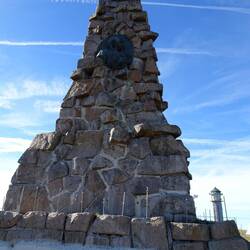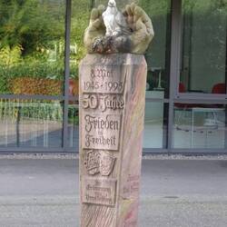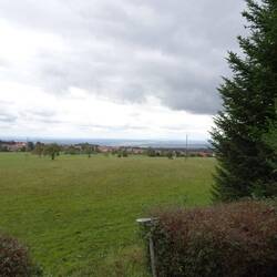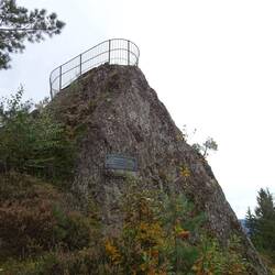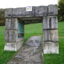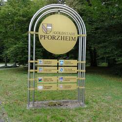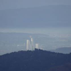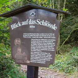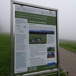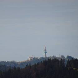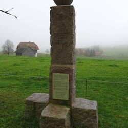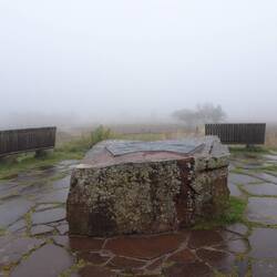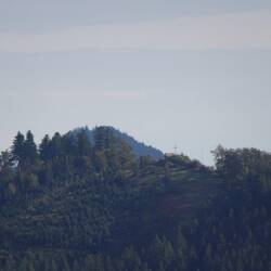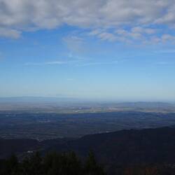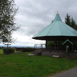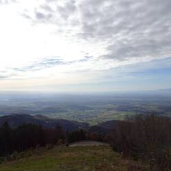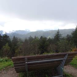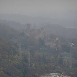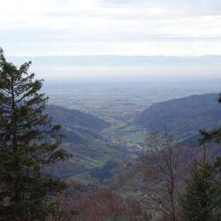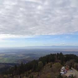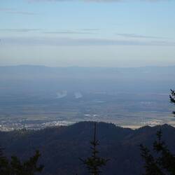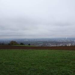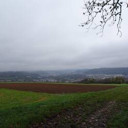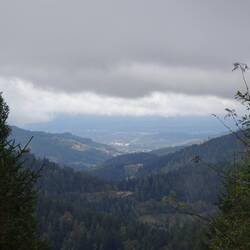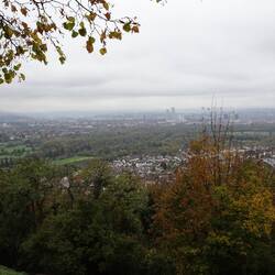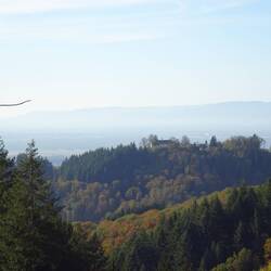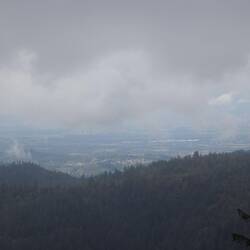 Kurz hinter der Burg Rötteln befindet sich das Wegwegportal Dreiländereck Lörrach. Von der Anhöhe gibt es heute einen leicht nebeligen Ausblick nach Süden auf Lörrach.