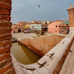 122 Stufen sind es auf den Turm des Castello Estense und von oben sieht man mehr als von unten- Binsenweisheit.