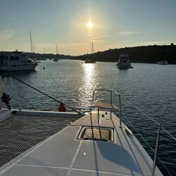 Mein Brot ist derweil auch aus dem Ofen und so steht einem entspannten Mittagessen aus Nudeln mit verschiedenen Soßen, Salat und frischem Ciabatta nichts mehr im Wege. Dabei gleiten wir mit gesetzten Segeln und knapp 5 Knoten Geschwindigkeit übers Meer. Unser heutiges Ziel ist die Bucht, in der wir schon unsere erste Nacht verbracht haben. Es ist zwar wieder recht voll, aber dennoch nehmen wir witzigerweise dieselbe Mooring wie am letzten Samstag. Nr. 38 steht dran und auch der Blick auf unsere Fotos von Samstag bestätigt dies. Am Samstag kam niemand zum Abkassieren, aber heute dauert es nicht all zu lange bis der Marinero mit seinem Boot angefahren kommt und die Gebühr für die Nutzung der Mooring abzukassieren. Man zahlt dabei je Meter Länge und wenn man Glück hat, kann man auch direkt noch einen Müllsack mit loswerden. Wir paddeln dann noch eine große Runde durch die Bucht, machen Fotos für meine Instagram Yoga Seite und beobachten später die weiteren Boote, die sich in der Bucht einfinden. Es ist nämlich ein wenig wie Kino, wenn man sieht welche Manöver so an den Tag gelegt werden um das Boot an der Mooring zu befestigen. In unserem Fall sieht das übrigens wie folgt aus: Rüdi und Holli liegen vorn im Netz, mit einem langen Fischerhaken bewaffnet, während ich mit der dicken Leine bewaffnet bereit stehe, um Holli das lose Ende zu reichen, was er durch die Öse an der Mooring fädelt, die Rüdiger derweil mit dem Haken aus dem Wasser nach oben gezogen hat. Wenn es durchgefädelt ist, wird mit einem zweiten Haken das Seil wieder hoch gezogen, wo es Anne in Empfang immer und nach Backbord rennt um es an der Klampe zu befestigen, während ich gleichzeitig den Rest der Leine Steuerbord über die Reling ins Wasser werfe. Und Gunthi versucht dabei, in seinem gewohnt souveränen Art den Katamaran nach den ihm zugerufenen Anweisungen zu steuern. Das klappt mal besser und mal schlechter, aber schlussendlich sind wir dann immer fest und glücklicherweise haben wir kaum Wellen, Wind und Seegang.so dass es perfekt für uns Anfänger geeignet ist, um zu üben. Wenn das Manöver geglückt ist, gibt es bei den Männern das obligatorische Anleger-Bier. Nach dem Abendessen und einer Runde Wizard, geht’s dann auch ins Bett, denn ich habe 7 Uhr eine Verabredung…Lue lisää