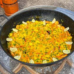 Beata und Paco haben für heute zur Paella eingeladen, wahlweise mit Fleisch oder mit Meeresfrüchten.