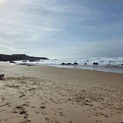 Die Hunde, allen voran natürlich Meca sind direkt unter dem Zaun durch, runter an den Strand geknallt. Natürlich streng verboten.
