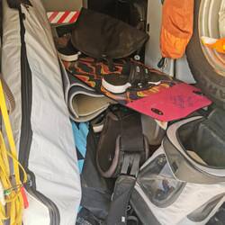 Eine Alternative wäre es eventuell noch, das Brett quer hinter den Roller zu legen. Da muß ich mir dann auch keine Gedanken mehr über die Beleuchtung machen, denn die vom Auto sieht man dann überhaupt nicht mehr. Allerdings muß dafür dann der Roller runter, oder die Fußschlaufen müssen ab. Daher muß der Hobel vorerst in der Heckgarage bleiben.