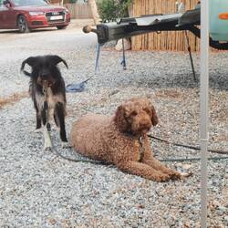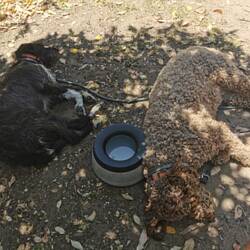 Dazu ist der Untergrund Kies, den man prima mit Wasser abspritzen kann, um es kühler zu bekommen. Gut, man könnte auch die Hunde - speziell den wasserscheuen Wasserhund -wässern, aber das gefällt den Mädels nicht