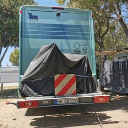 Zudem haben ich jetzt zwei Tage an meinen Rollerträger rumgebastelt, um das Brett irgendwie ans Heck zu bekommen, ohne den Roller dafür runterholen zu müssen.