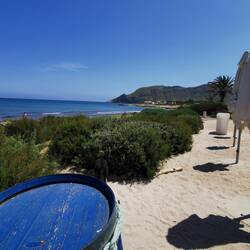 Ich hatte unterwegs kurz überlegt, mich wieder in die Palmenbucht zu stellen, zumal die ganze Küste im Gegensatz zum Herbst richtig leer ist, aber dort hat Salma damals den Angelhaken geschluckt und ich wollte das Schicksal nicht unbedingt herausfordern, zumal ich sie jetzt nicht mehr in den Rucksack bekomme, um mit dem Roller nach Aguilas zum TA zu fahren