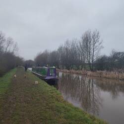 After emptying bins and the pee pot and filling with water, Vicky and the furries travelled inside while a well wrapped Will steered on the stern. The journeying was slow going with what seemed like miles of moored boats lining the banks. When passing any stationery craft it's expected that you drop your engine into tickover (about 2mph as opposed to the usual 4mph) so your wake doesn't unduly disturb the floating homes. Despite the slow pace it wasn't too long before we got to Barbridge Junction, taking the tight left turn off the wide Shropshire Union mainline on to its narrow Middlewich Branch. From her vantage point at the side hatch Vicky didn't think Rainboat would make it round, but the feared collision never came as Will executed the manoeuvre in one- bravo Will 👌