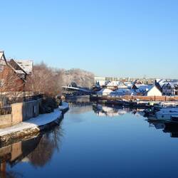 As Will ferried luggage from the hire van to the boat it began to snow. By bed time there was a proper covering and we woke the following morning to a world blanketed in white. After returning the car, shopping and dropping off a 'thank you' bottle of JD for Adrian he piloted Rainboat out of the quay and downriver for the last time. Despite the cold temperatures the channel hadn't frozen and we assumed that because there was a flow, there wouldn't be a problem. Well you know what they say about assuming don't you...