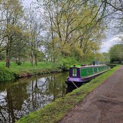We tied up to shiny new mooring rings near an out of town logistics warehouse. Trees on the offside surrounded a series of fishing lakes. There was access via the footbridge just behind us. We and the dogs really enjoyed taking a round route for once and there were surprisingly few people there considering it was Easter Sunday. They may have given up and gone home, as the fishers we spoke to said they weren't having any luck. The peaceful environment suited us and we even caught sight of a kingfisher; always a treat!Lue lisää