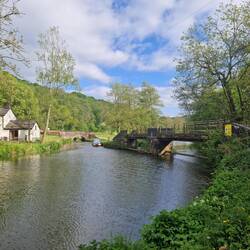 We walked the dogs, then John and Will visited the nearby Foxley pub for lunch while Vicky rested. After this we untied Rainboat and set off to tackle 6 locks and a lift bridge. The Caldon is particularly wiggly but before long there was a straight bit, so in a teacherly way, Will handed the tiller over to John without giving any guidance, just asking him to 'get a feel for it' 🙈 Luckily John picked up the knack of steering quickly and took us to the first lock. Vicky took over at the stern while he and Will worked Rainboat through the locks. We saw lots of tiny ducklings, bluebells, a swathe of wild garlic in flower and even our first ducklings of the season. There are some rather expensive looking homes along this stretch and the last lock was opposite a golf course.
