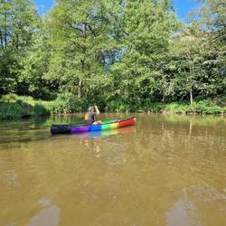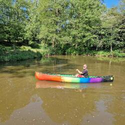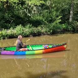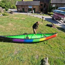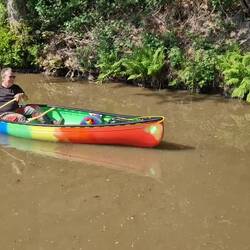 We'd taken our canoe, Little Green off Rainboat's roof and attached her tow rope to the stern because of low bridges. When Will was out fishing one day he was approached by a local who asked if he'd consider selling her. We'd had her nearly 20 years and she was pretty beaten up but still good to paddle. We'd been thinking of replacing her with a shorter, lighter boat that would be easier to lift and take up less room. The guy already had a couple of sit on canoes but wanted one that he could take his staffy dog paddling in so we agreed on the sale and he returned with a trolley. She's given us a lot of happy memories and we hope she goes on to give this man and his dog many more!Lue lisää