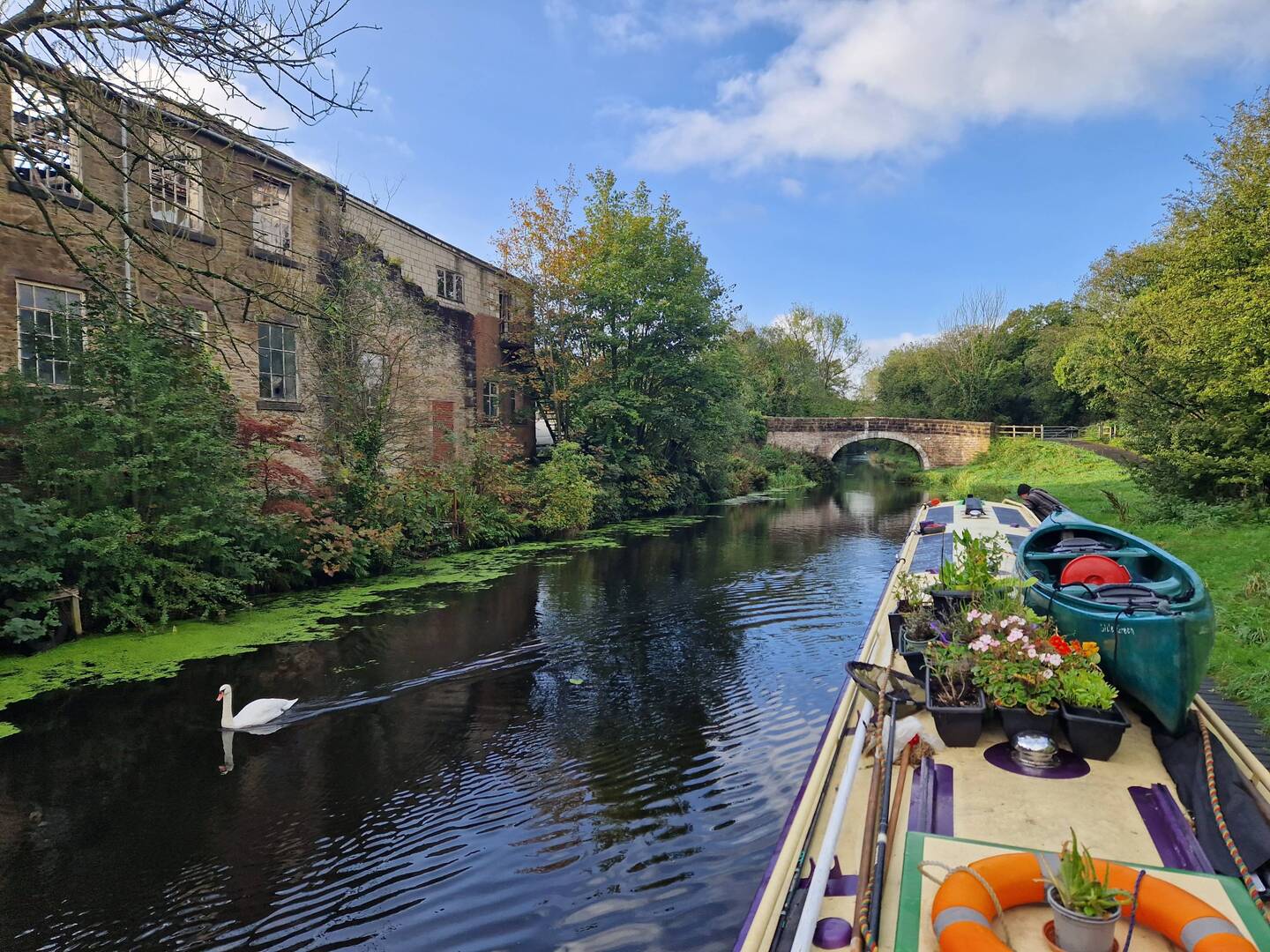 We cruised for 4.5 hours today without a single lock or swingbridge. It was a pleasure to take in the varied scenery and Vicky had fun steering through the 511m long Gannow Tunnel. Our route included the Burnley Embankment, also called the Straight Mile and one of the seven wonders of the waterways. Earth, taken mostly from Gannow Tunnnel, lifts 1148m of the canal as high as 60ft, bridging the deep Calder and Brun valleys and avoiding the need for locks.